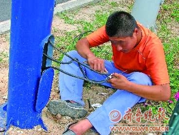12日,文化西路一工地,一名来自黄河北济南郊区的中学生穿着校服进城来,跟着父亲一起打工挣学费。小伙子倒是心灵手巧,接起电线来挺熟练,酷暑让他的小脸热得通红。 本报记者 周青先 摄