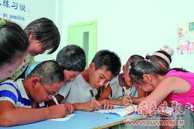12日下午4时许,在德城区一家英语培训学校,孩子们争相填写齐鲁晚报·今日德州主办的“非常营销秀”的报名登记表。
