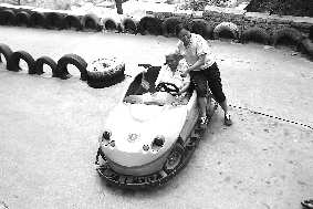 11日,在烟台南山公园,一位老太太正在开旋风赛车,赛车场的工作人员不放心,一直在赛车旁边指导,可是老太太开得非常熟练,工作人员忍不住竖起了大拇指。
