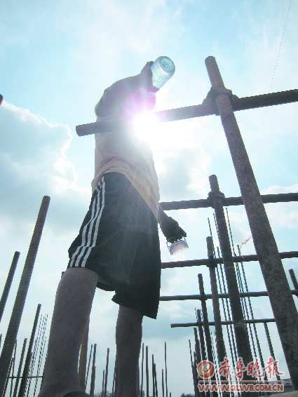 7月12日下午两点,市区渤海九路一家建筑工地的工人正在喝水。入暑以来,滨州市气温逐渐升高,在室外作业的人群顶着烈日劳作,需做好防暑准备。
