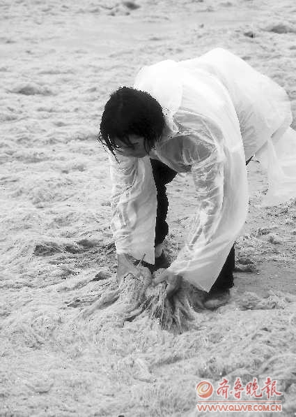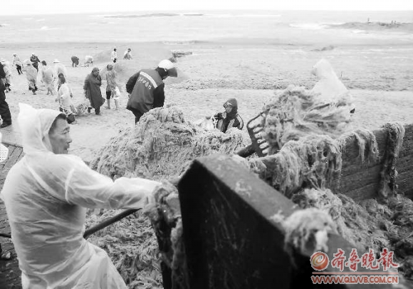在景区的沙滩、岸边,一百多名身披雨衣的浒苔应急队队员分成几个小组在清理浒苔,队员们用双手把沙滩、礁石上的浒苔装到纸袋里,然后抬到岸边,堆成一堆,再由拖拉机拉走。