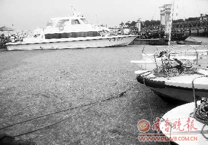 美轮号游艇停靠的码头已经被浒苔包围,艇长秦绪峰告诉记者,昨天的一场大风使得浒苔大量进入世帆基地,这给游艇出海带来了很大的麻烦。游艇下方有个“海底门”,是专门用来出水冷却发动机的,一旦有浒苔的话,很容易堵塞“海底门”,从而造成发动机出现故障,现在他们是能不让游艇出海就不出海。