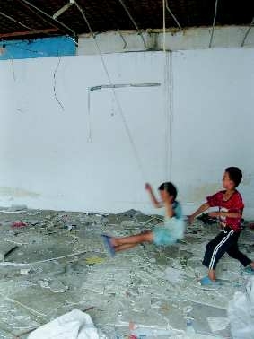 12日上午,在市区柳园南路一间等待拆迁的平房内,两个孩子用垂下来的电线玩荡秋千,屋顶的建筑板材摇摇欲坠。