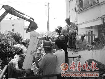 13日上午9时左右,记者在拆违现场看到,住户在一楼的公共平台上自行搭建了一处20多平方米的违法建筑。工人们首先用铁锤将阳光房上面的玻璃敲碎,然后挖掘机上阵,将砖石墙体结构进行清除。上午12时左右,阳光房的主体建筑已经被清除完毕。
