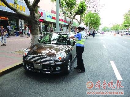 13日上午9点30分,四方交警大队人民路中队指导员李涛带领3名民警沿人民路由南向北巡逻,对违法停车现象进行整治,刚过人民路与鞍山路路口,就见临街店铺前停放有几辆机动车,民警刚到车前准备贴单时,从附近店铺中很快跑出几名驾驶人,要将车开走。一辆车号为鲁BA3F69的面包车司机称,刚到店里进点货,只停了一会儿,于是民警对他教育后放行。民警刚给一辆鲁B807EQ轿车贴上违法停车通知单,并照相取证后,驾驶人从附近店内赶出来要求“照顾”,民警让他拿驾驶证、行车证到大队进行处理。民警继续向北巡逻,可是当民警返回至此时,发现此处又违法停下车辆,其中一辆车号为鲁UE1631黑色轿车还逆向违法停车,由于没有驾驶人,民警对其张贴了违法停车通知单,民警沿人民路巡逻一趟,就对11辆机动车张贴了违法停车通知单。