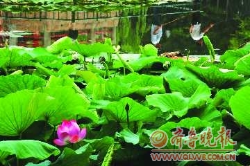 13日,在中山公园小西湖,两名钓手的倒影与盛开的一朵荷花相映成趣,别有一番意境。据了解,目前中山公园内的少数荷花已处于含苞待放期,离盛放期还有半个月左右的时间。本报记者 张晓鹏 摄影报道
