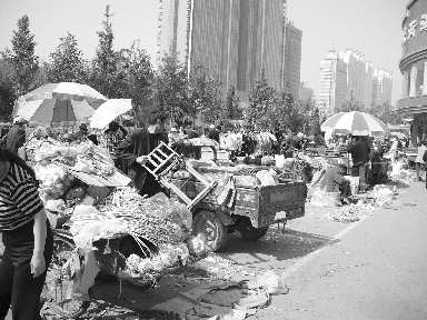 “早市出摊的一些菜贩子,运菜车辆乱停乱靠,将原本就不宽敞的道路堵塞,周边小区车辆进出经常堵车。特别是上班高峰期,一些菜贩还没卖完货,一直占压道路叫卖,混乱的状况让过往行人和周边居民无法忍受。”朝阳小区居民杨大爷告诉记者。