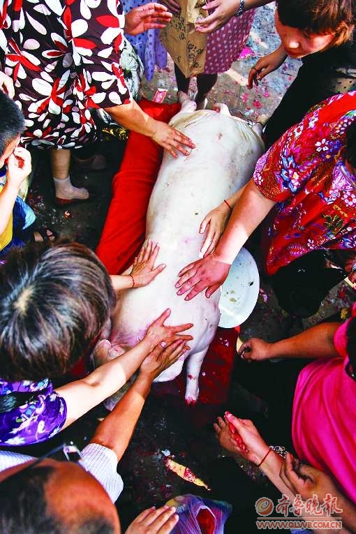 此时的观海园内人头攒动,祈福的香火燃烧的淡淡香气弥漫四周。参加渔民节的人们不等披红戴花的整猪落地,纷纷凑上前来捏猪耳,摸猪身,据说这样能给他们带来好运。待贡品面朝大海摆放整齐后,祭拜活动就开始了。鞭炮齐鸣、锣鼓喧天,彩绸飞舞,人们点燃供香,倒上美酒,供奉在龙王像前,祈求风调雨顺,出海平安。