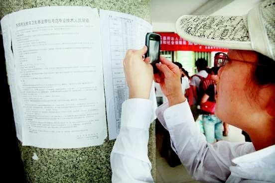 12日,在聊城八中教学楼一楼,报考者用手机拍下自己关心的招考岗位。当天,2011年东昌府区教育卫生事业单位考选专业技术人员开始报名,15日结束。本报记者 李军 摄影报道