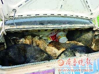 民警在轿车后备箱发现四条被毒死的狗(如图),并在车内发现毒狗药物。