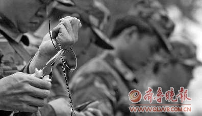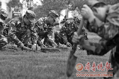 14日上午,武警济宁市支队教导队训练场上,划分出双37高炮项目、警棍盾牌项目和综合项目3个考区。在综合项目考区,民兵们整齐地蹲在地上,观看教练员演示反坦克地雷的埋设与拆除方法。“埋雷应避开沟壑,选择平坦的地面。坑的直径应略大于地雷的直径。”这位教练员说,坑圆、底平、壁直是挖坑的动作要领。埋完地雷后,余土要放入包裹带出阵地。拆除地雷后,雷坑要复原,消除作业痕迹。