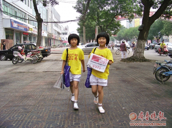 14日,肥城市的7岁双胞胎报童姐妹走上街头卖报。当天,“激情夏日,快乐成长——报童营销秀”第一期活动在泰城、肥城、新泰全面铺开,三百报童上街卖报。