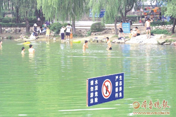 记者顺着水库南坝来到东岸,只见四名十五六岁的男孩带着游泳圈在水内玩耍,他们身旁就是“儿童在水边玩耍,必须有成人陪同”、“水深危险勿游泳”的警示牌。半个多小时后,又有七八名学生模样的男孩子换好衣服后下水。“天气这么热,我们五个伙伴转到虎山公园,于是下水凉快凉快。”泰安二中初二学生李华说,他们约了出来玩,考虑到费用问题便到虎山水库游泳了。记者注意到,虎山水库沿岸一周竖立了四五个警示牌,也难以提高游泳者的警惕性。在虎山公园摆摊的牛女士说:“我们天天在水库边卖东西,对下水的人提心吊胆,也提醒过他们,但每年都会有溺水事故发生。”