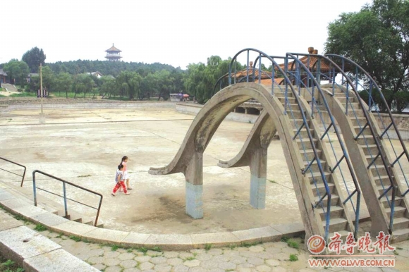 “这个游泳池大多数时间是闲着的,天不下雨,池中便没有水,市民也无法游泳。”在虎山公园经营小摊的李先生说,每年7月份开始,如果雨量较大,仅仅需要一两个小时这个池子就能灌满,池水清澈见底,来游泳的人多得就像“下饺子”一样,这个地方便成了众人游乐的“天堂”。