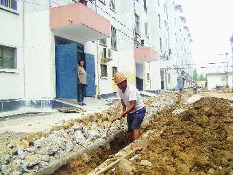 14日上午,一走进丝绸厂家属院,整个小区是一片繁忙景象,楼道前开挖出一道道沟壑,工人们正在进行自来水户表改造,楼上工人们正在粉刷墙壁,新购进的垃圾桶也已经整齐地摆放在仓库里,随时准备“上岗”。