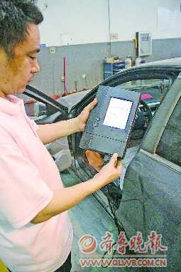 7月15日下午,在凤凰路一家4S店,记者见到了号称“汽车医生”的解码器。这个解码器大小如同一台笔记本电脑,厚如板砖。维修人员通过解码器上的数据线与汽车方向盘下方的接口相连,对汽车上的各个系统进行全方位检测。