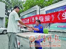 自7月1日起,市民可以在5处中石化加油站购买齐鲁晚报。位于英雄山路的中石化济南分公司第一加油站站长吴晓南表示,现在每天的销量能有近50份,很受加油市民欢迎。图为一市民正在加油站购买晚报。 本报记者 陈伟 摄