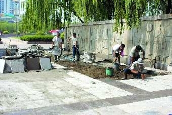 17日,施工人员正在重新铺设人民广场下沉路面。