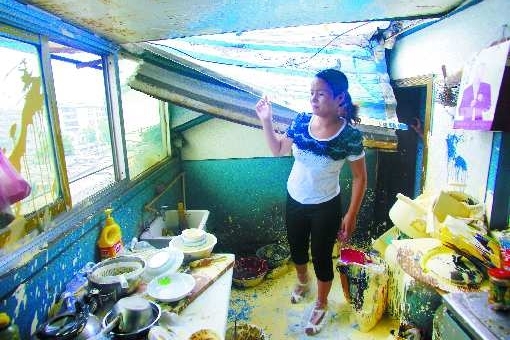 本报7月17日讯 (记者 廖杰)16日,市民尤女士致电本报,一名在楼顶上刷涂料的工人将她家厨房的屋顶踩塌并跌落下来,黄色涂料洒满了整个厨房。