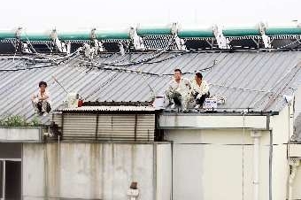 记者看到,在尤女士家对面的楼顶上,有几名施工人员正坐在复合板覆盖的屋顶上休息。“小心点,屋顶不牢固!”见此情形,尤女士大声提醒对方注意安全。