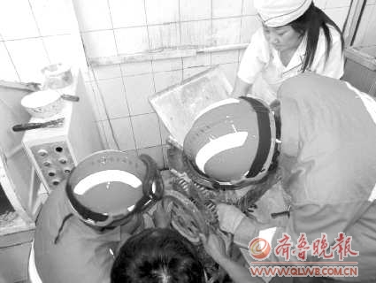 7月16日下午3点左右,哈尔滨理工大学荣成校区食堂发生一起意外事故,一女工作人员右手被挤入绞面机并大量出血,荣成消防大队两车12名官兵赴现场实施救援。经过两次试撬,出事员工右手被成功救出。现场待命的医务人员立即将其扶上救护车,送往就近医院治疗。