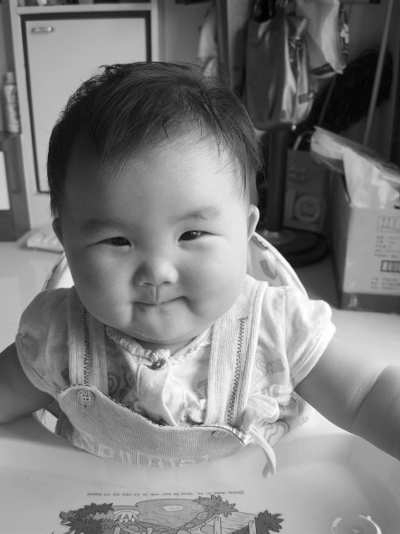 光看照片,谁能看出我是男孩还是女孩?我经常被误认为男孩,妈妈只好一次又一次地跟大家介绍,我是个漂亮的小姑娘。真不好意思,因为我太胖了怕热,不得不剃个光头,真羡慕别的小女孩可以扎小辫。我体重26斤,嘿嘿,是有点超标,可又管不住自己的嘴巴,惭愧啊!