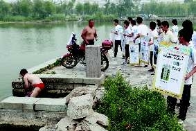17日上午,水城集团东昌湖管委会工作人员和本报“野泳劝阻队”志愿者在运河博物馆南侧,向路过市民讲解随意下湖游泳的危险性。一名男子抱着救生圈下水,当东昌湖管委会工作人员上前制止时发现,这名男子下水只是为了下水捞一条鱼。