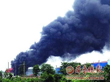 原油池大火产生的滚滚浓烟随风飘向西南。 本报记者 张浩 摄