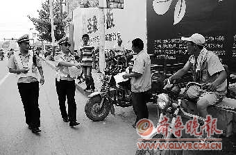 自7月中旬开始,济宁交警三大队针对汽车北站附近交通拥堵问题开始了为期一个月的集中整治。18日上午,记者采访了解到,通过一个多星期的治理,该区域存在的摊位、店铺占道经营以及营运三轮占道等活儿等乱象已大大减少。图为民警对非法营运小三轮的人员进行劝解。