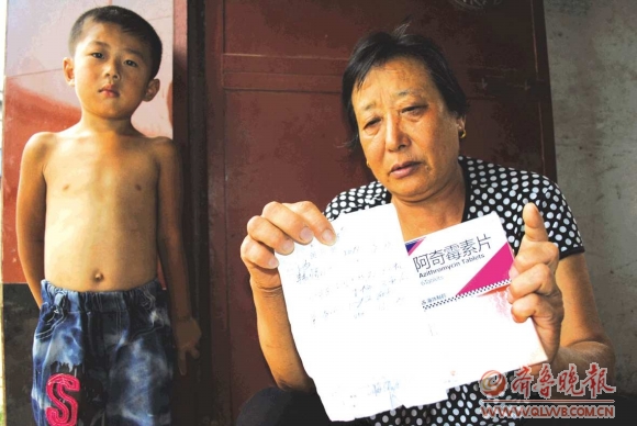 家在事故地点东侧200米外的陈秀芳,向记者展示这两天来社区卫生室给她和孙子开出的处方和部分药品。