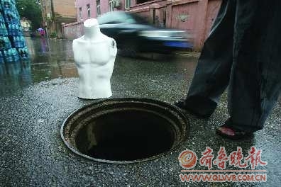 近,市民高先生和一个塑胶模特站在一处缺失的古力井旁,提醒过往车辆避让。据了解,这处古力盖被一辆大货车压碎,已经缺失4天,附近居民反映多次仍没结果。