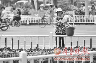 7月18日上午,天气闷热,工作人员在给三角花园的植被浇水降暑。