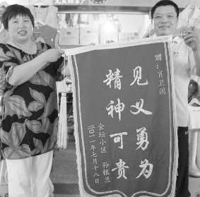▲市民孙女士将一面锦旗送到肖卫国的手中表达感激之情。
