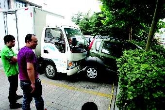 18日,在福寿街北海路路口附近,一辆轿车被一辆小货车顶到绿化带的水泥墩上,两个轮子处在悬空状态。据了解,当日上午10点左右,轿车停在绿化带边,但不知道什么原因,停在后面的一辆货车突然向前冲,就把小轿车顶到了绿化带水泥墩上,小轿车上的人员在冲击力的作用下,头碰到了车玻璃上,受伤被送往医院。
