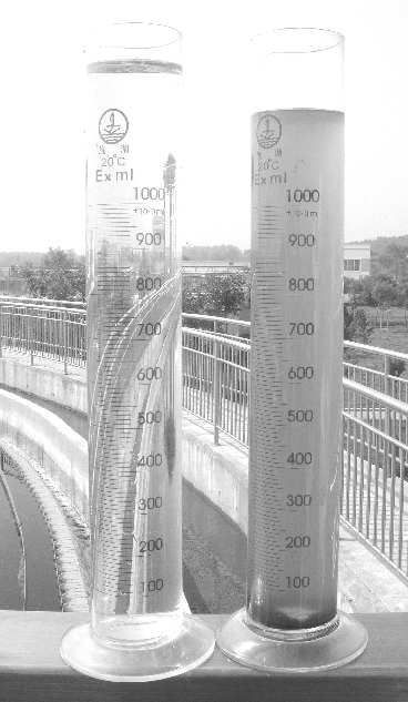二沉池中的水体(右侧)稍微浑浊,流出的水体(左侧)已经比较清澈。