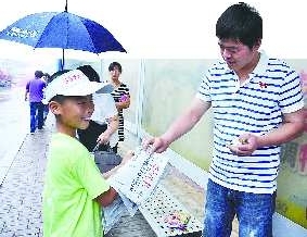 本报7月18日讯(记者 熊戈措) 18日一早下起了小雨,本报“华夏城报纸营销大赛”的许多参赛小选手们仍像平时一样早早来到幸福等发行站点领报纸,有的参赛小选手带着包报纸的塑料布,有的则干脆背个大书包,“不能让报纸给雨水淋湿了”,参赛小选手们坚持冒雨卖完报纸。