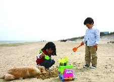 作品描述:两个孩子在海边嬉戏,旁边还有一条很温顺