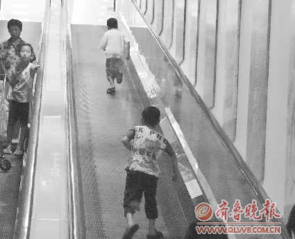 7月18日下午,记者在市区一家超市的电梯上看到,两名儿童把电梯当成了跑步机,在短短一分钟时间内在两条电梯道上跑了四个来回。其中一条电梯道已经停运,但是并未放置任何停运的提醒标志;而另一条电梯道还在运行,儿童在上面来回跑动十分危险。
