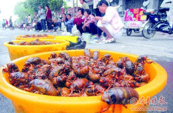 鄄城董口镇王潭村的赵海滨做了三年收金蝉的生意,一直为石险峰“供货”。一到金蝉出土旺季,他就每天晚上八点多,走村串巷收金蝉,直到深夜,第二天一早再赶到县城卖,赚取其中的差价。“今年收的比较少,价格也高,有很多捉金蝉多的‘大户’都自己来县城卖,还有一些喜欢吃金蝉的城里人开着私家车直接进村收。”