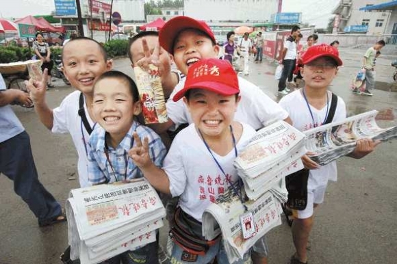 去年暑假,百余名小报童快乐体验卖报。(资料片)