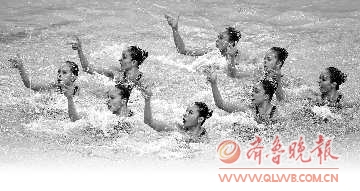 中国姑娘们身着黑色泳衣亮相,入水后,水池中霎时出现了八位“邦德女郎”,一个漂亮的托举动作马上赢得了满场欢呼,八个姑娘随即用手做出了手枪的造型。从菱形变成斜线,从斜排变成直排,队形在不断变化的同时也保持得非常紧凑。在规定动作结束后,姑娘们开始拿出她们的看家本领,双腿的上旋和下旋动作整齐划一。最后在一个集体入水的动作后,来自东方的“邦女郎”出色地完成了她们的“任务”,获得了96.800分,为中国代表团拿下一枚银牌。