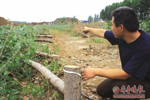 7月19日凌晨,泰山区上高街道办事处韩家结庄至少4户居民农田里的数百棵速生杨、果树和农作物被砍倒和毁坏。图为村民宋其武无奈地看着自家被锯倒的杨树。