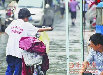 一件枣红色的旧雨衣,三个大号的塑料袋,再加上勤快的脚步和乖巧的嘴巴,19日,小个子的郑敏娜骑着自行车,带着60份报纸在大街小巷转着。“叔叔阿姨要报纸吗”,虽然头发都已经淋湿,也多次被误认为是年龄较小的孩子,每次郑敏娜卖出一份报纸总会笑着回应,“我13岁,不小了,要上初三了。”本报见习记者 韩伟杰 李岩松 摄影报道