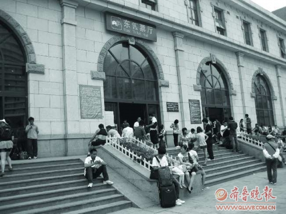 19日,记者来到青岛火车站,在东售票厅门口,已经没有前几日排队购票的长龙,在售票厅内,排队买票的乘客也不是很多,相反在东进站口的两个通道上,出行的乘客排起了长队,队伍一直延伸到台阶下的广场上。