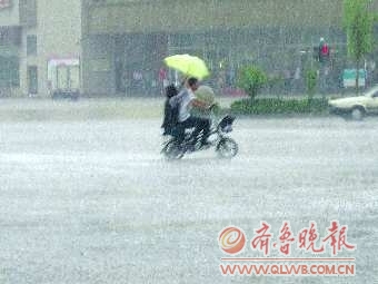 7月19日上午,一场急雨如约而至。在儿童乐园附近的十字路口,骑电动车的市民在雨中疾驰而过。