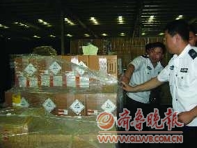 随后,记者来到青岛港物流公司的危险品库看到,库内摆放着两大集装箱的次氯酸钙危险化学品,重约46.6吨。“这两个箱子本已经运到船上准备出海,我们通过技术手段检测出来了。”据青岛市海事局一名张姓工作人员介绍,次氯酸钙属于危险化学品中的第五类“氧化剂和有机氧化物”,遇到高温很容易燃烧,极易发生炸船的危险。