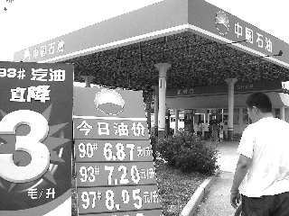 本报7月19日讯(记者 李娜) 93#汽油每升直降3毛!93#汽油7.20元/升!在港城西大街一处中石油加油站,大型的降价宣传板非常醒目。随着国际油价跌破100美元大关,各地成品油价格出现松动迹象。在港城,部分加油站已以各种名义悄悄降价。