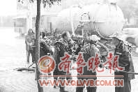 7月19日上午,市政处在黄河一路的南杨桥上设立了两台抽水机作为临时泵站,强排路面的积水。“由于这一段路的地势比较低洼,靠水自然排流速度会很慢,所以我们就安置了两台抽水机,把检查井里的积水迅速地抽到张肖堂干渠里。”市政处市政设施监察大队队长张军告诉记者,“从目前状况来看,排水的效果很好。”
