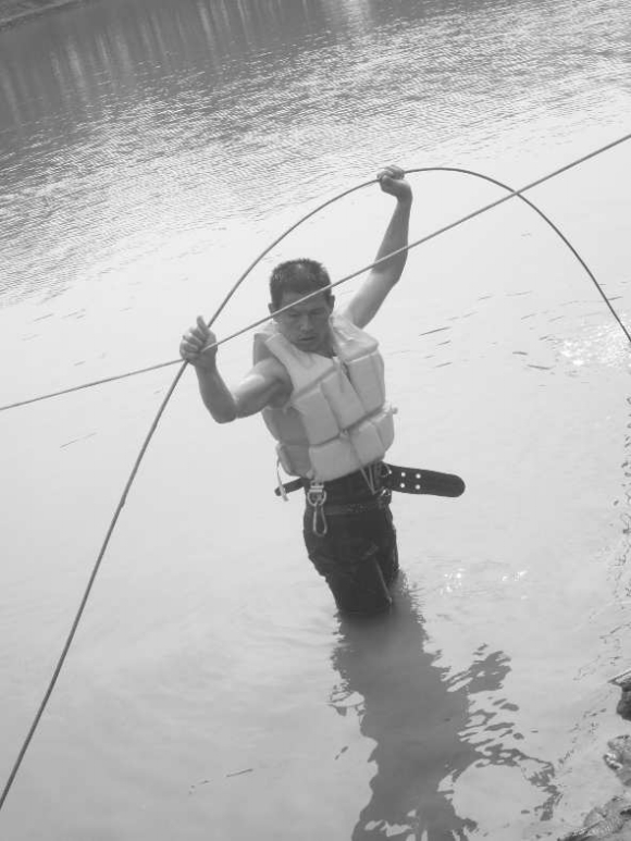 为尽快找到溺水者,消防队员把一条绳子横在水坑中间,岸两边有专人拉着,救援人员用手扶着绳子下水寻找。由于水太深,救援人员根本没办法潜到水底。一名救援人员介绍,水坑表面的水不凉,但一米以下的水有点凉,待时间长了身体受不了。