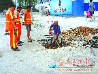 市政施工人员在泺源大街进行截污治理,本报记者 王光营 摄